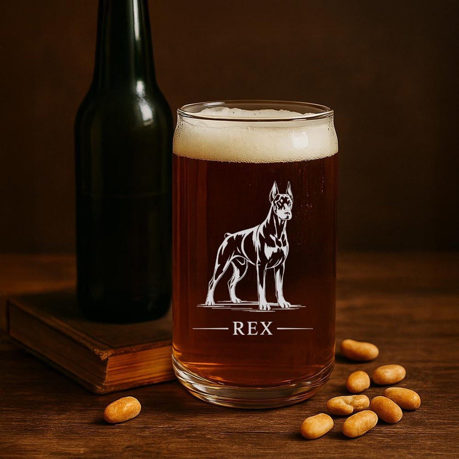 Custom Name Doberman Pinscher Dog Beer Can Glass | Etched Doberman Pinscher Dog Sihouette Beer Can Glass | Gift for Dog Lovers
