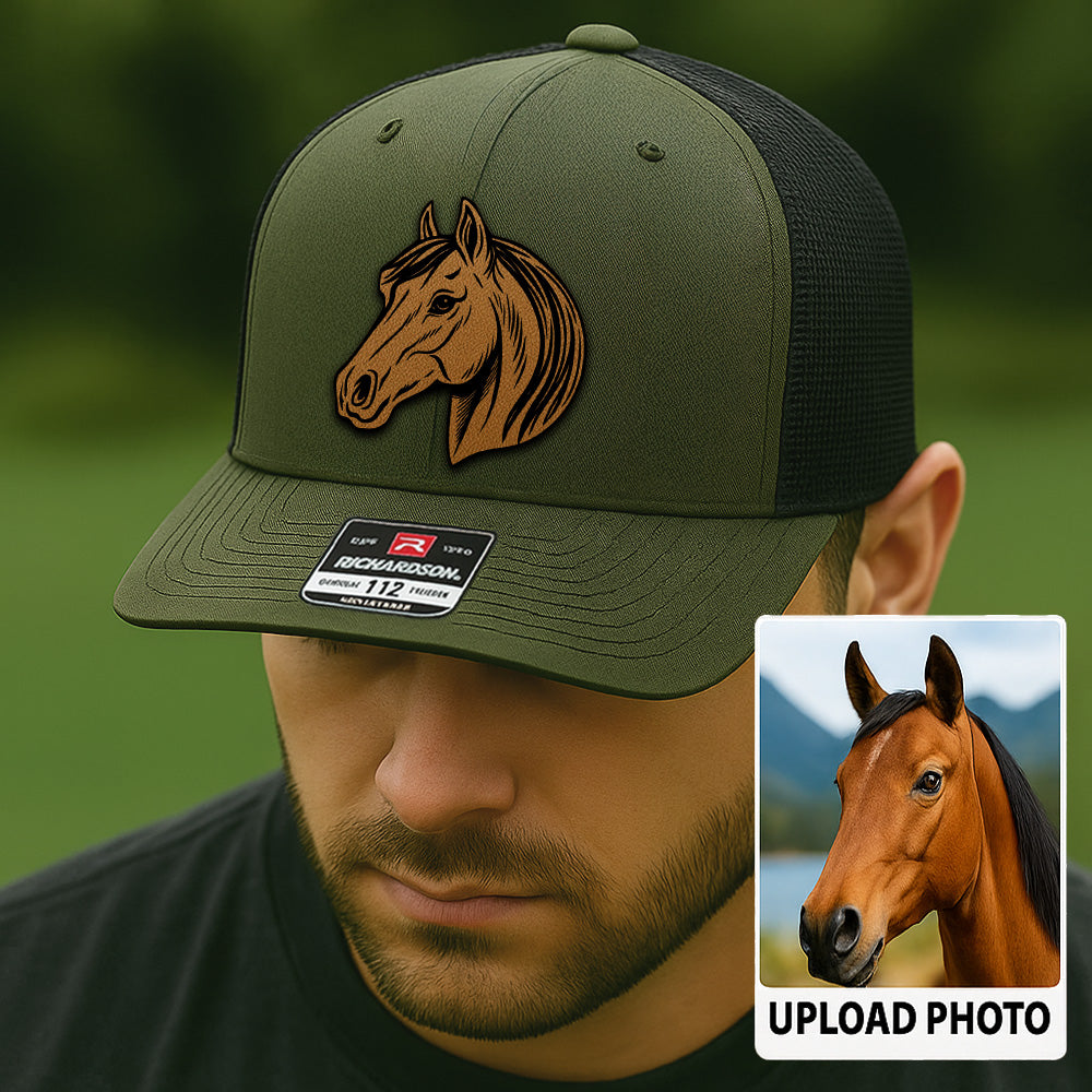 Custom Pet Photo Trucker Hat – Personalized Leather Patch Hat – Horse Portrait Gift – Custom Pet Face Hat P99A17