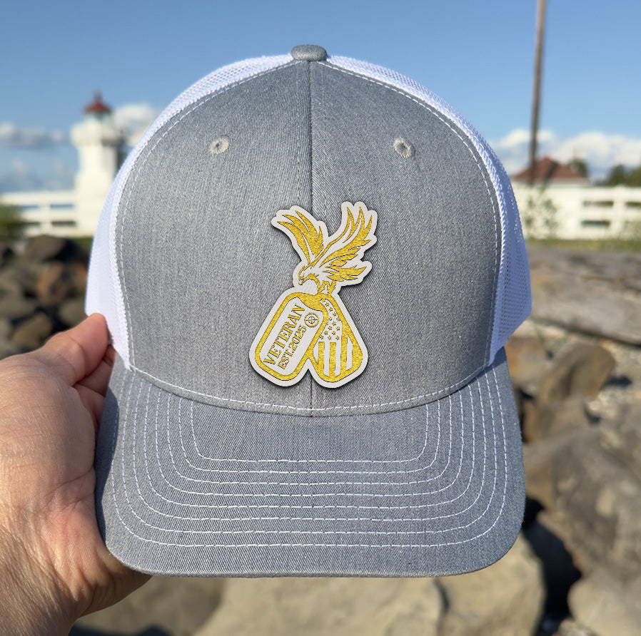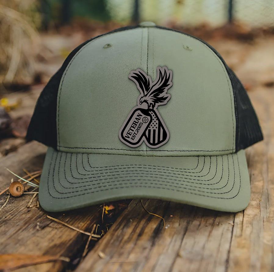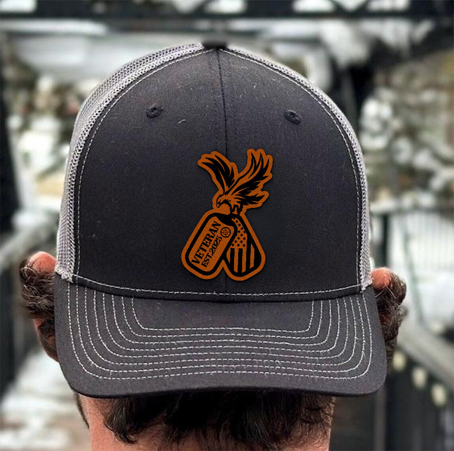 Veteran American Flag Leather Patch Hat – Patriotic Trucker Hat for Men – USA Military Gift – 4th of July Veteran Cap – Rustic USA Mesh Hat NGOC99NT06