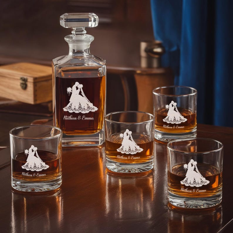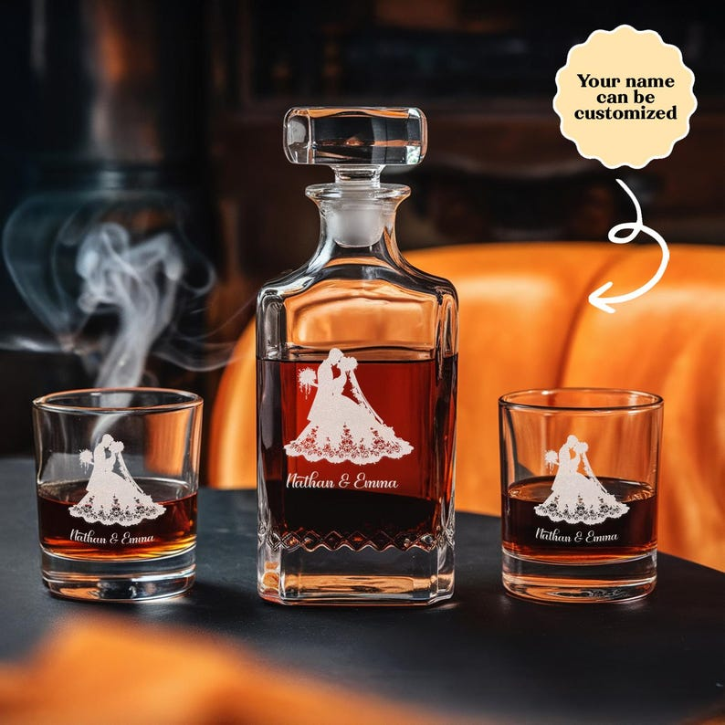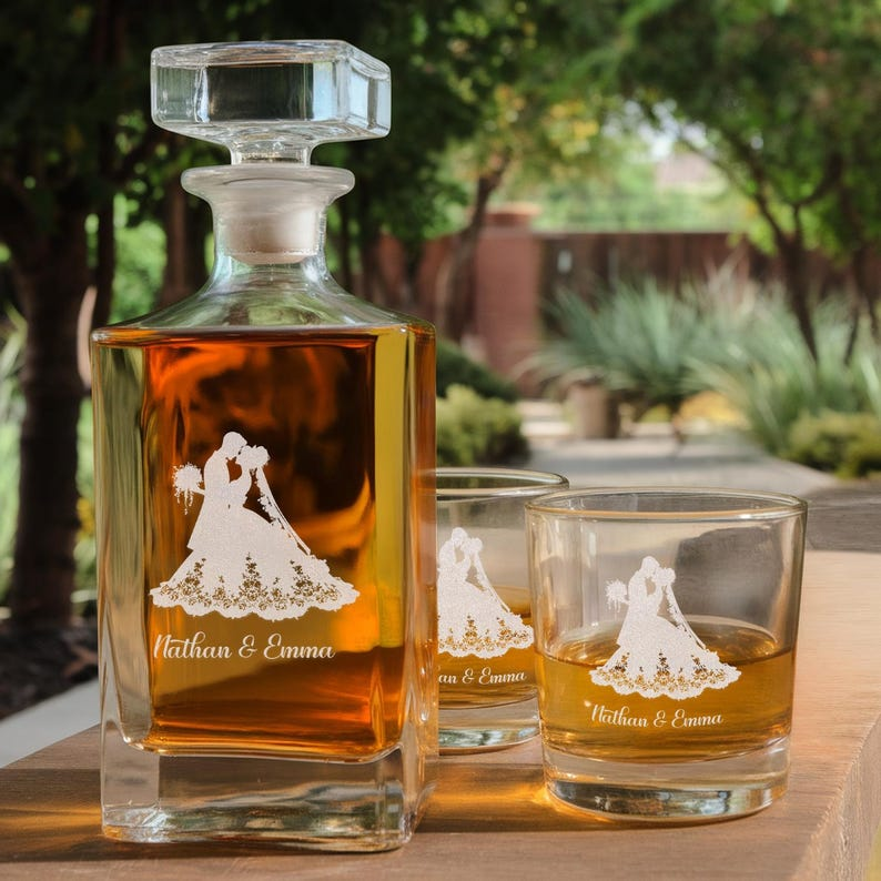 Personalized Name Bride And Groom Decanter Set And Whiskey Glasses | Engraved Whiskey Decanter Set | Gift For Wedding