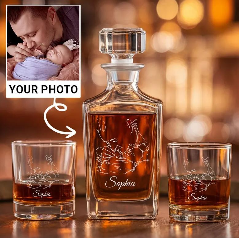 Personalized Dad And Kid Photo Whiskey Glass And Decanter Set | Best Gift For Dad | Engraved Gift For Dad