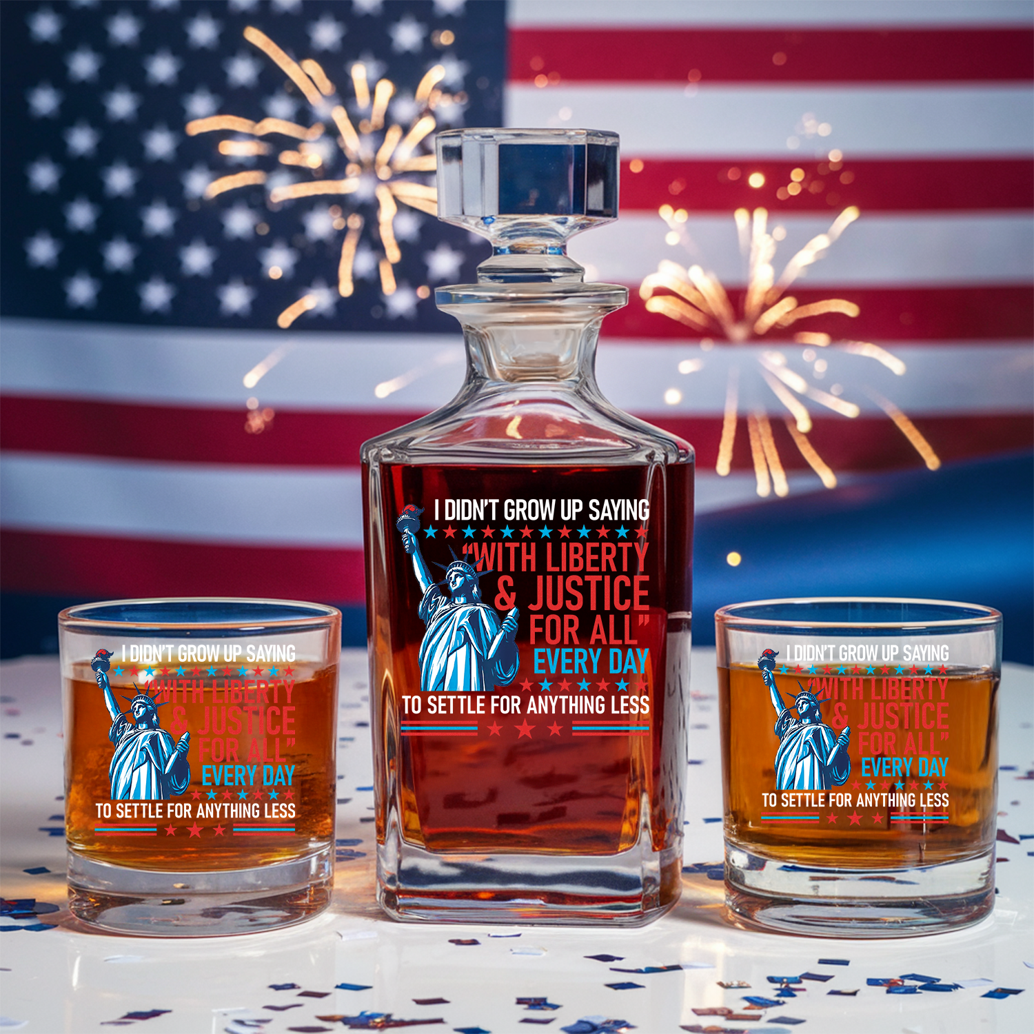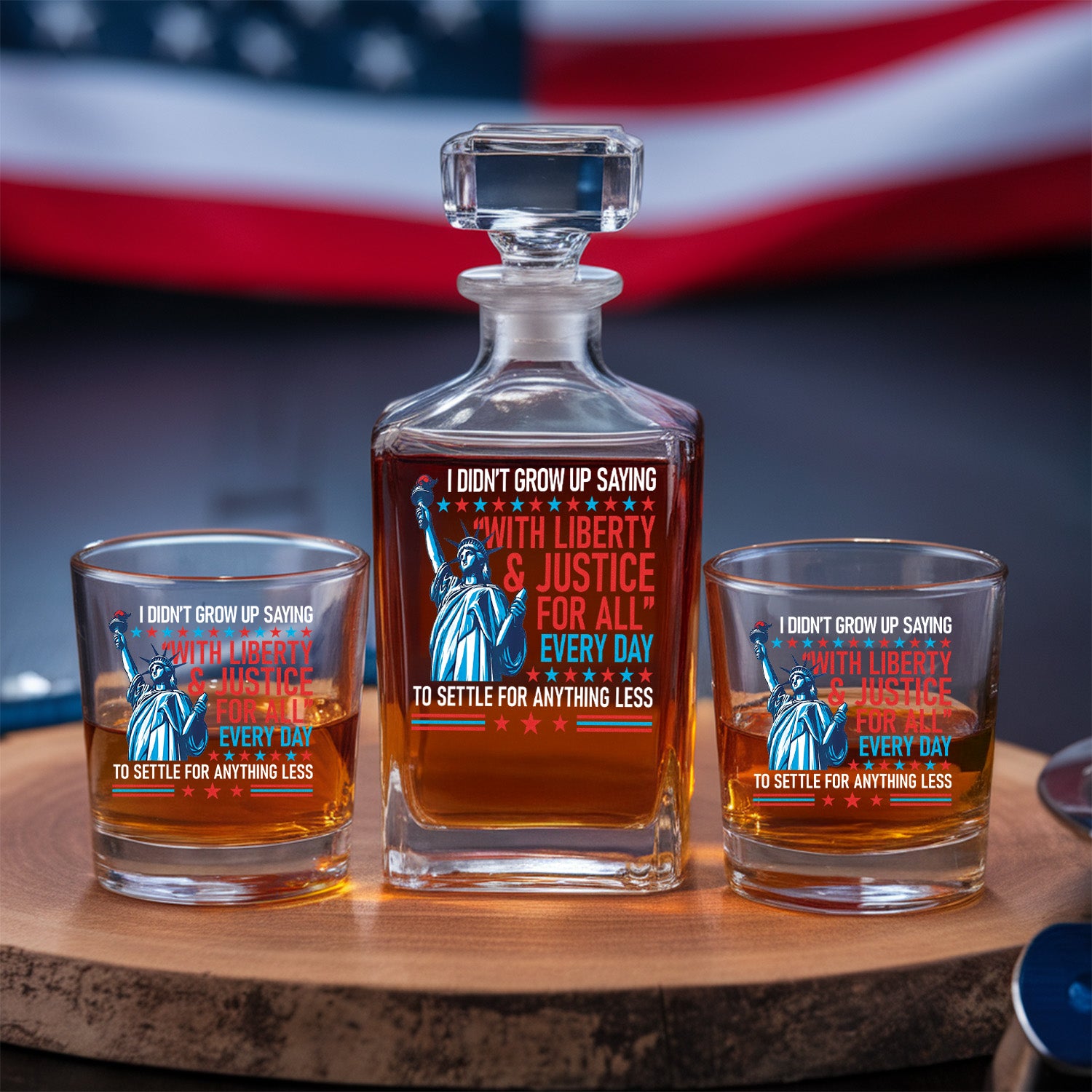 Patriotic Liberty and Justice For All Decanter Set With Whiskey Glasses, 4th of July Gift, Military Veteran Gift, Veteran Whiskey TND084